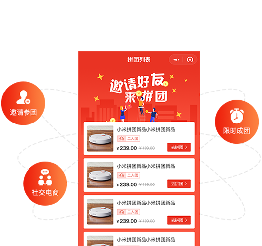多人拼團,社交獲客基于微信社交開展拼團,依靠朋友圈的飛速傳播,提升品牌影響力,促進消費者分享帶來商品銷量,商城訂單成倍提升,增加收益。